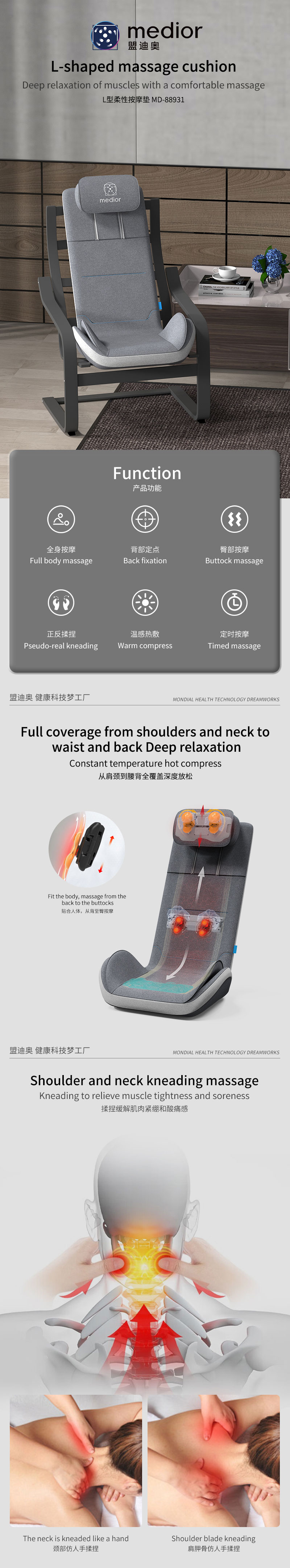 1、L型機(jī)芯結(jié)構(gòu),對(duì)折包裝縮小體積2、獨(dú)家專利柔性機(jī)芯3、力度三檔調(diào)節(jié),定點(diǎn)按摩,腰背按摩、臀腿按摩、全背按摩模式選擇4、背部行走揉捏,按摩區(qū)域加長到從肩膀到大腿;5、更加貼合不同款式的椅子整體可對(duì)折收納