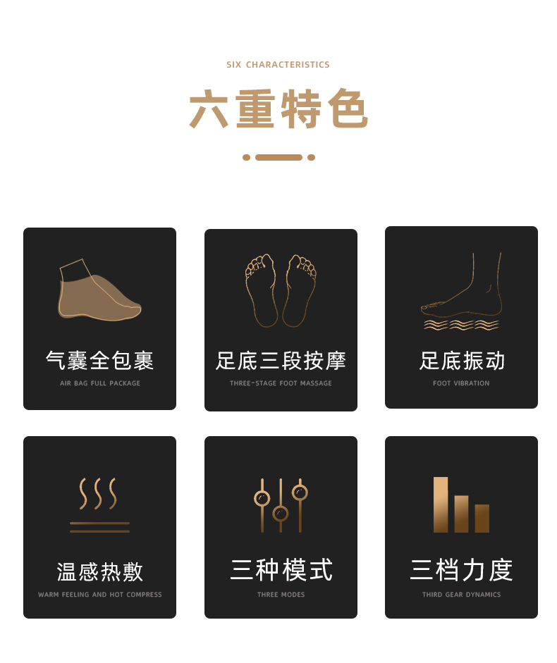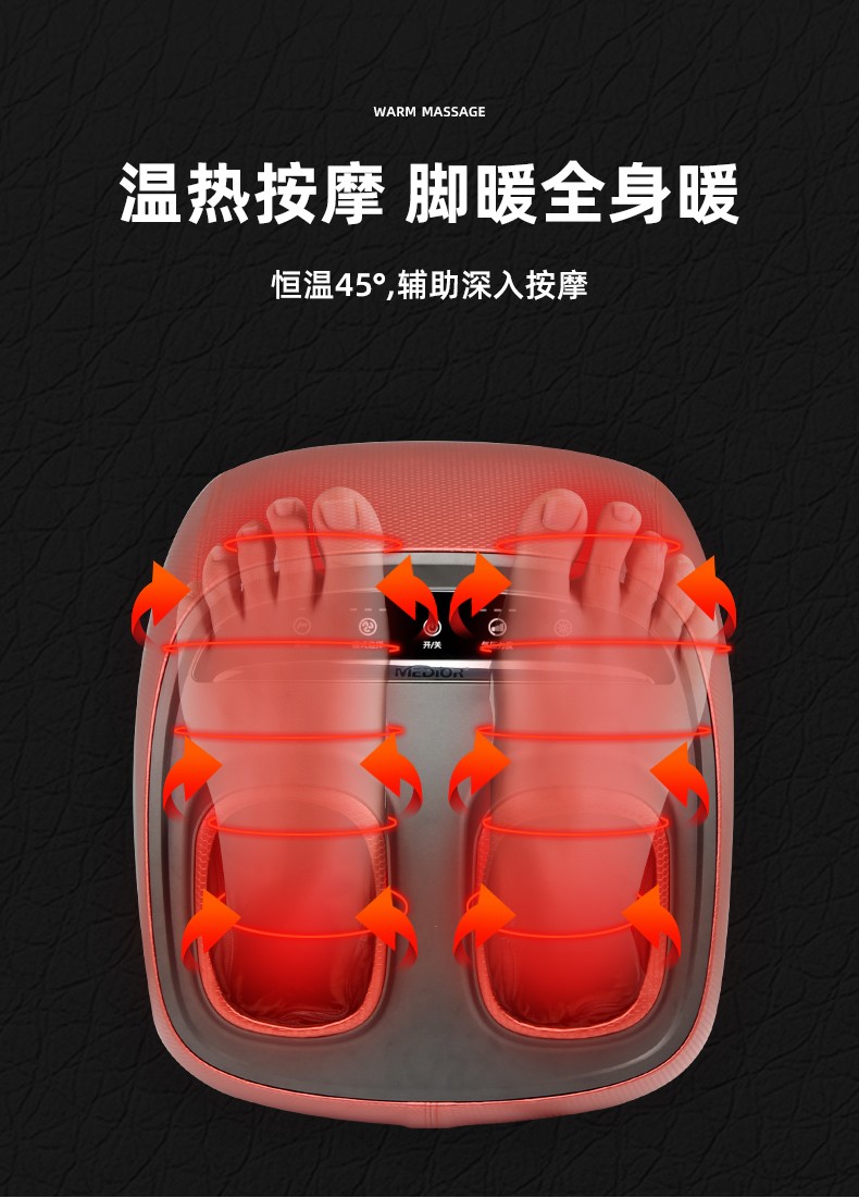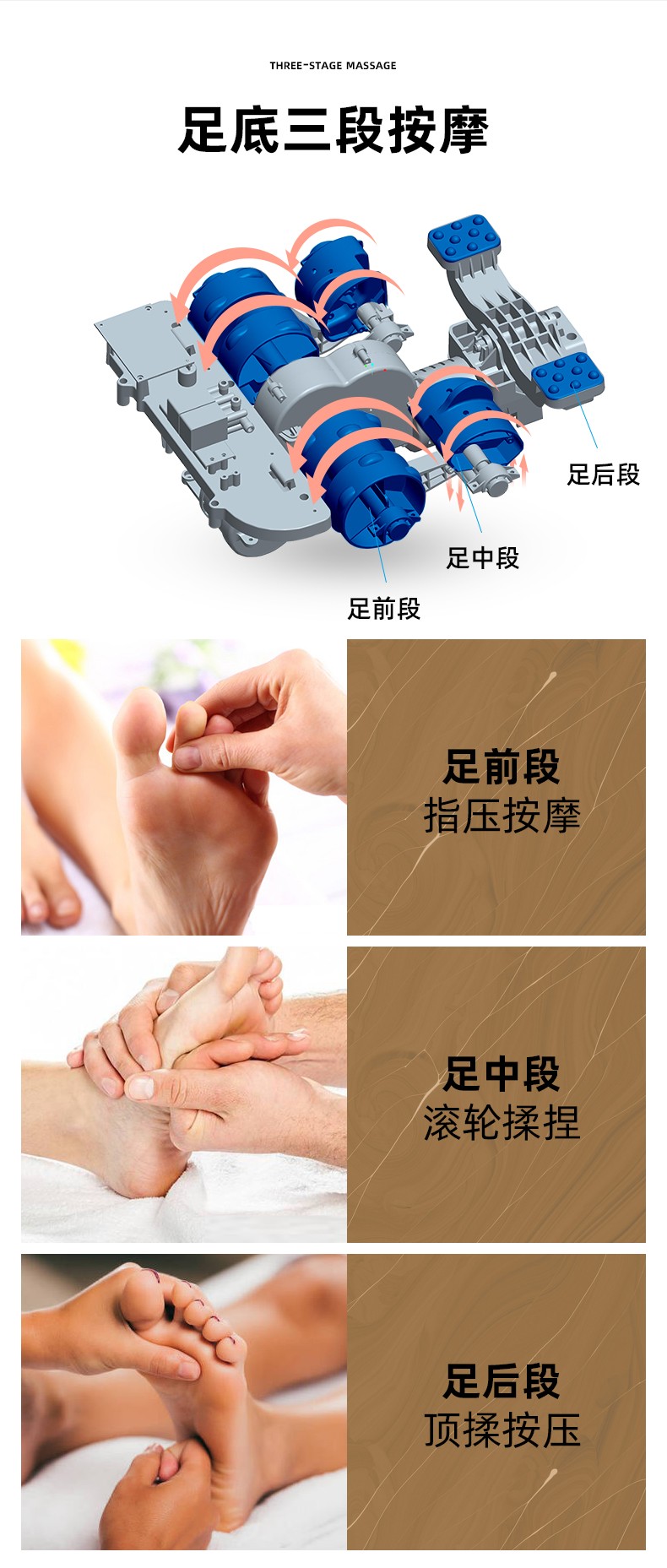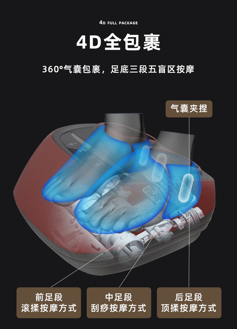 滾輪按壓(腳趾)、刮痧(腳弓)、捶打(腳后跟)按摩 (多模式,多強(qiáng)度);